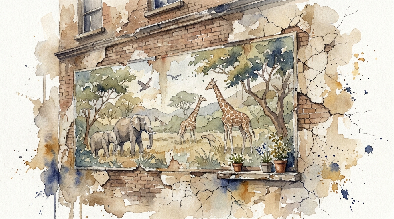 Then someone had a different idea. Instead of leaving the wall blank, they invited artists to paint a mural. Bright, bold, enormous. Children, animals, parks, a whole story sprawling across the facade. That was over five years ago. Nobody has touched it.